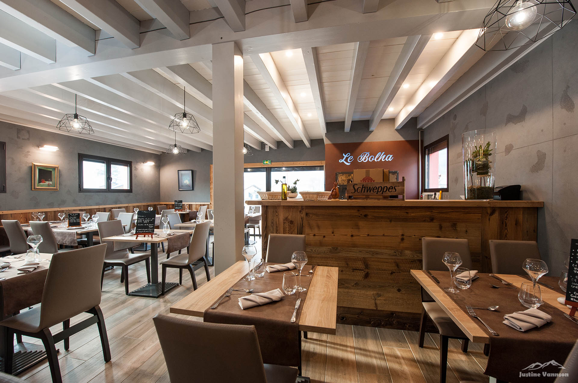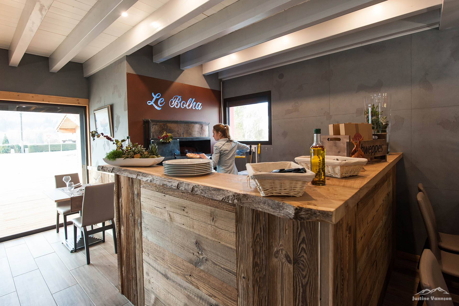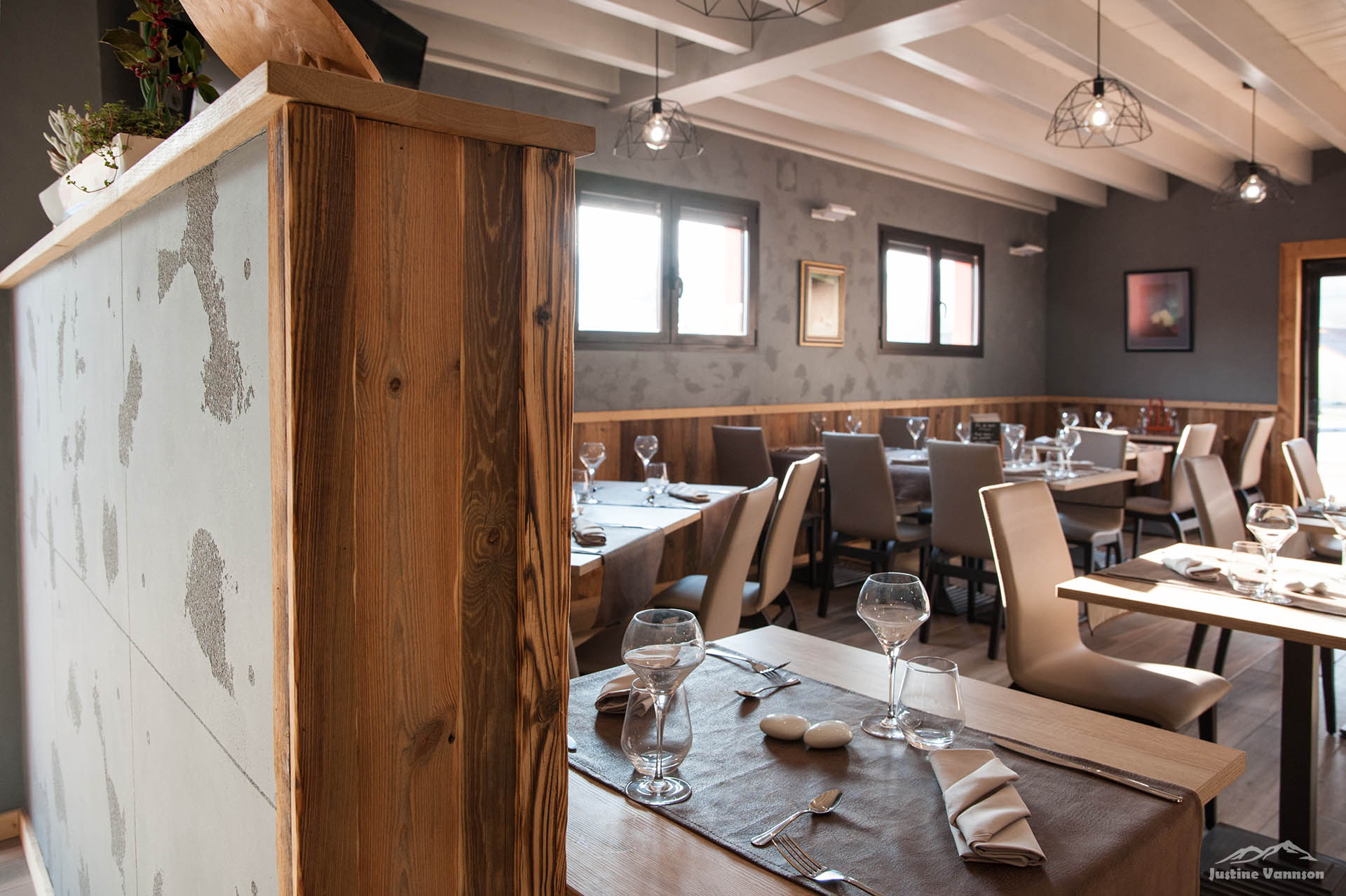 L’agencement est un mix entre le vieux bois résineux et le vieux chêne. Tout à été pensé pour le confort des clients du restaurant et pour que les employés s’y sentent bien aussi.