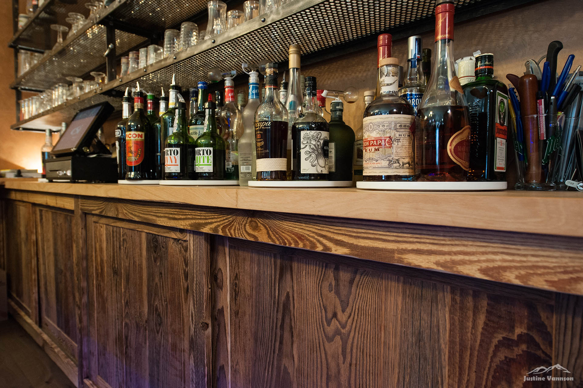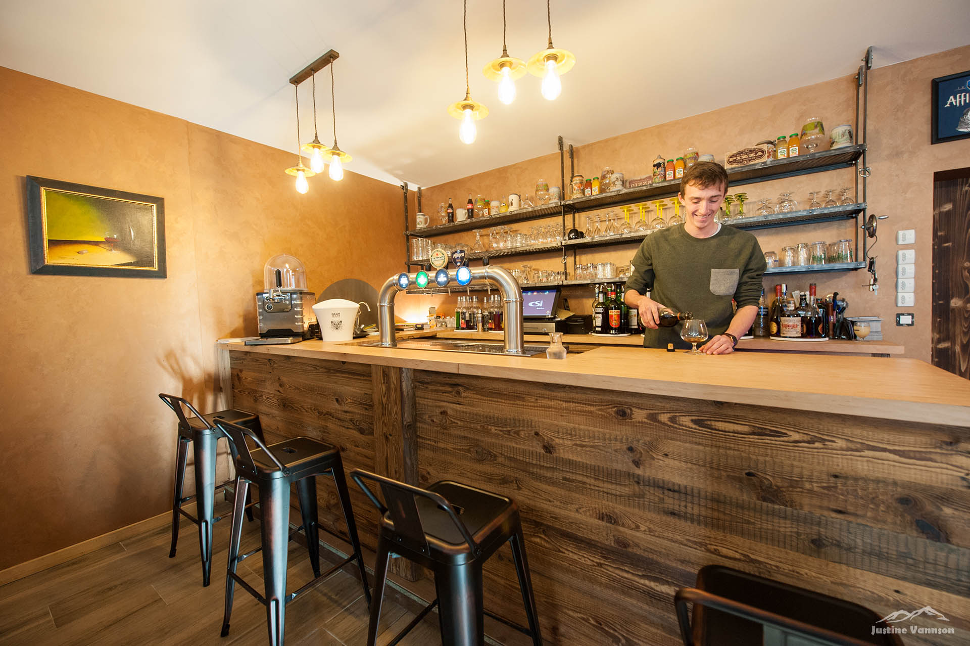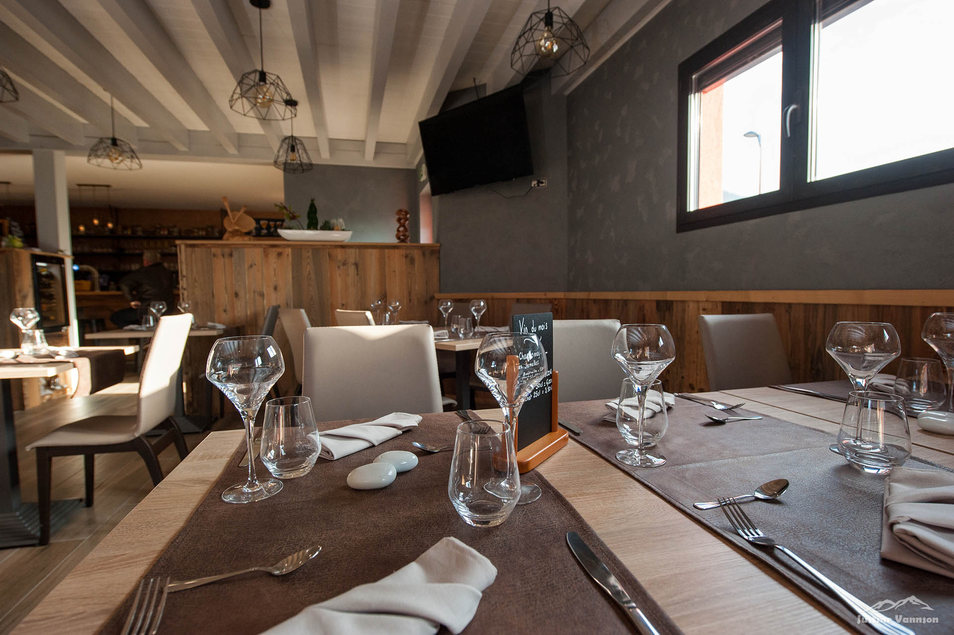 L’agencement est un mix entre le vieux bois résineux et le vieux chêne. Tout à été pensé pour le confort des clients du restaurant et pour que les employés s’y sentent bien aussi.