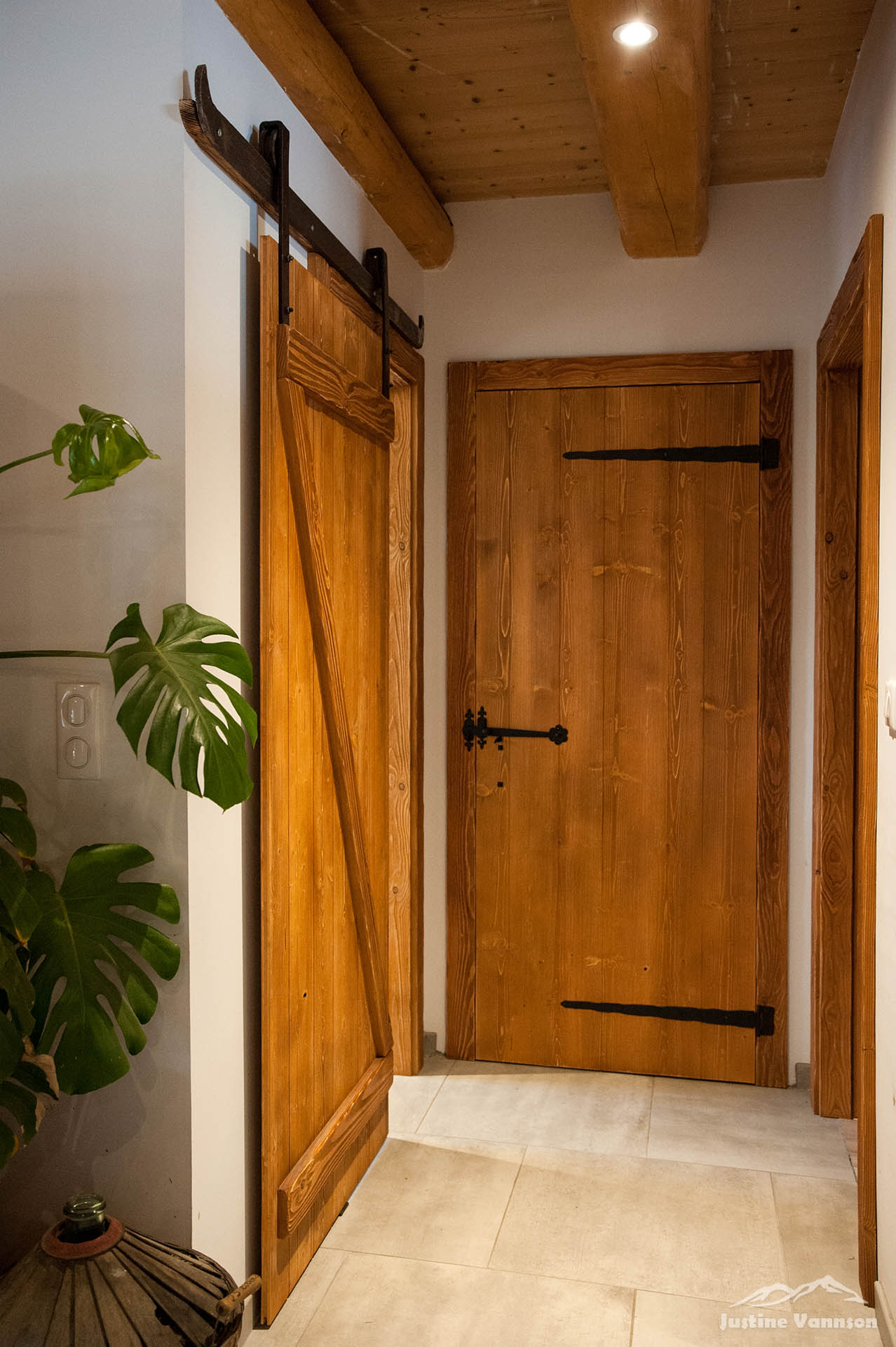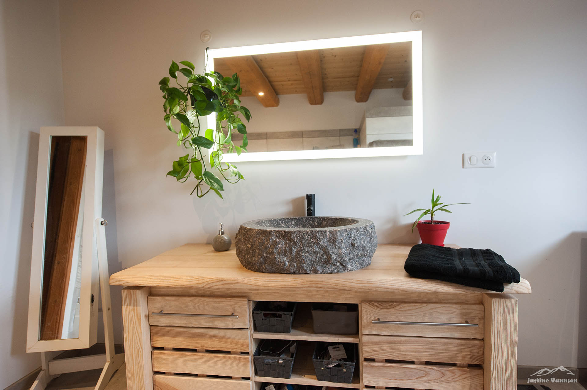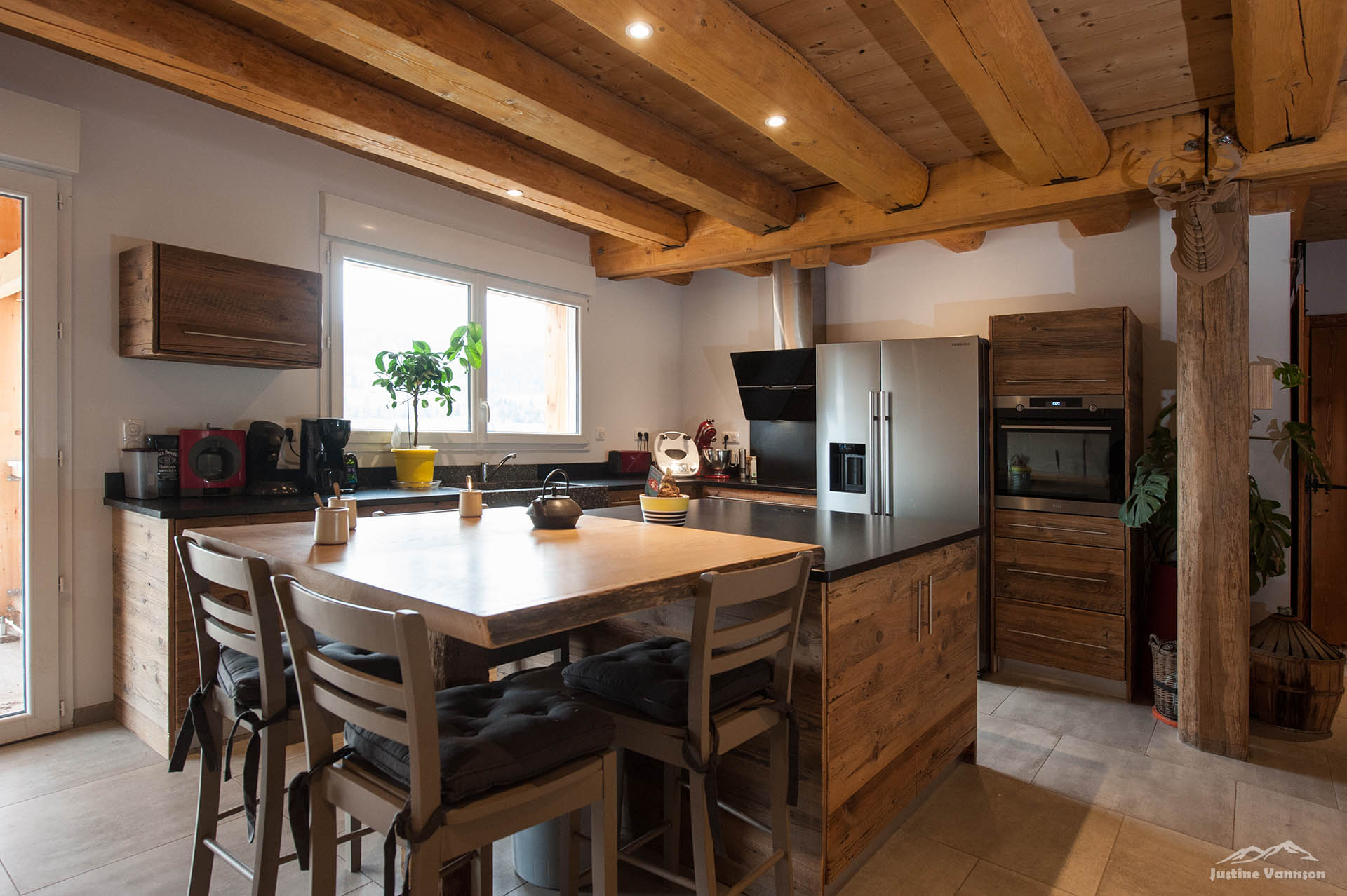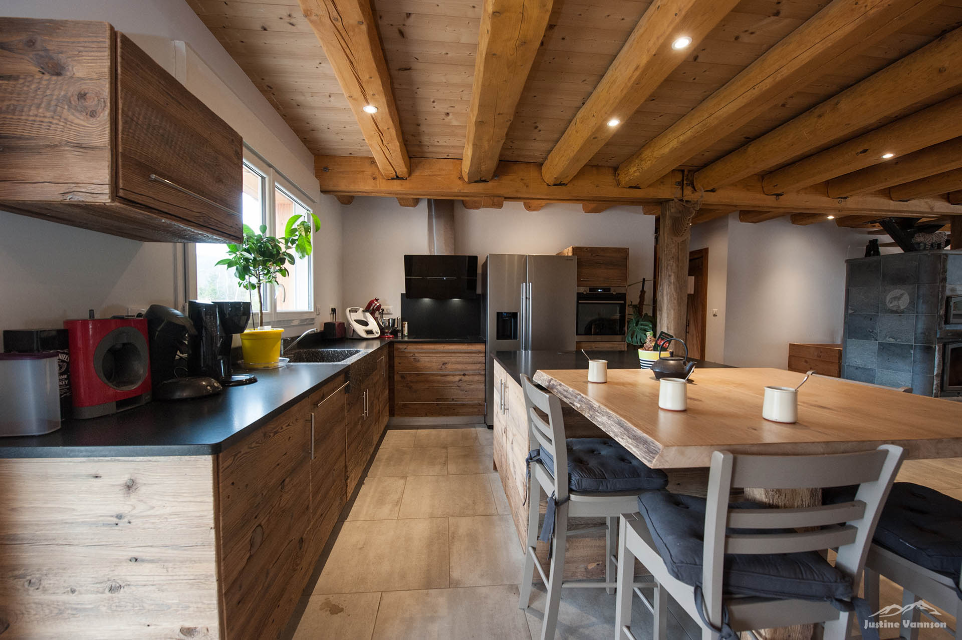 Portes en bois brossé sur chambranle, coulissante avec des vieux fers forgés… Un meuble de salle de bain au design travaillé, vasque en pierre. Et pour sublimer l’ensemble, une cuisine en vieux bois aux lignes contemporaines ! Alliant fonctionnalité, originalité et esthétique, cette cuisine est là pour sublimer l’espace à vivre.