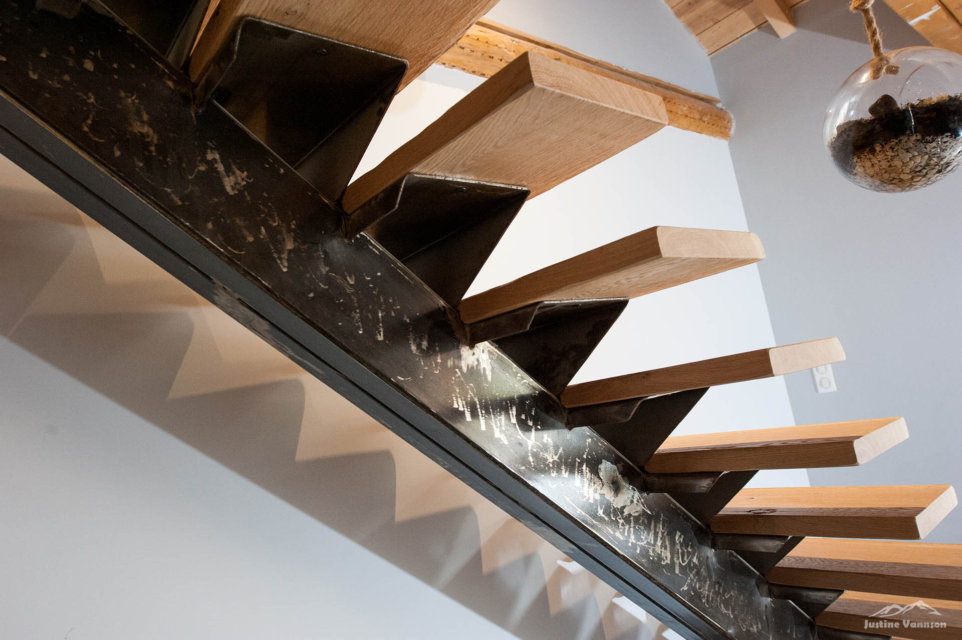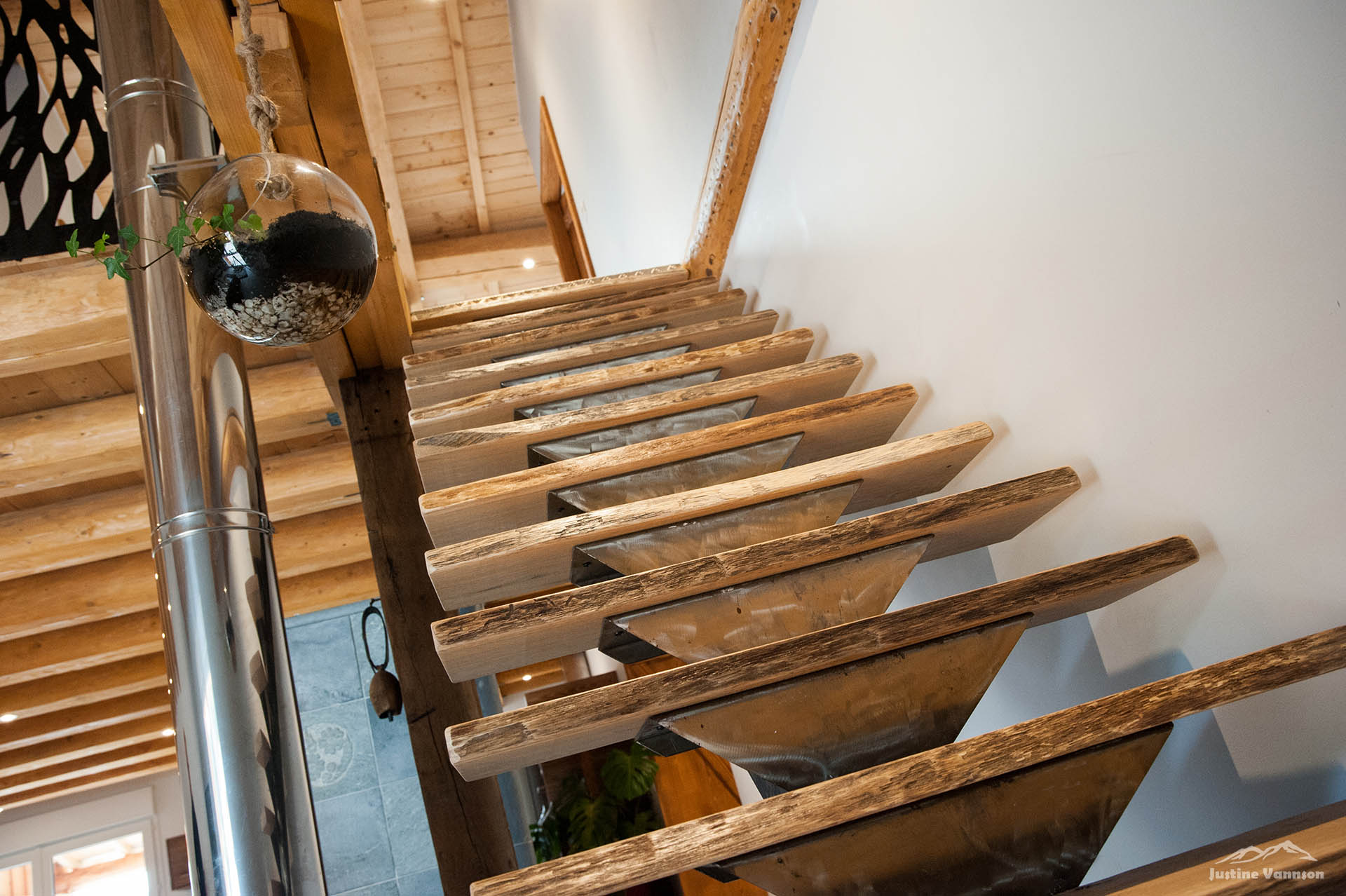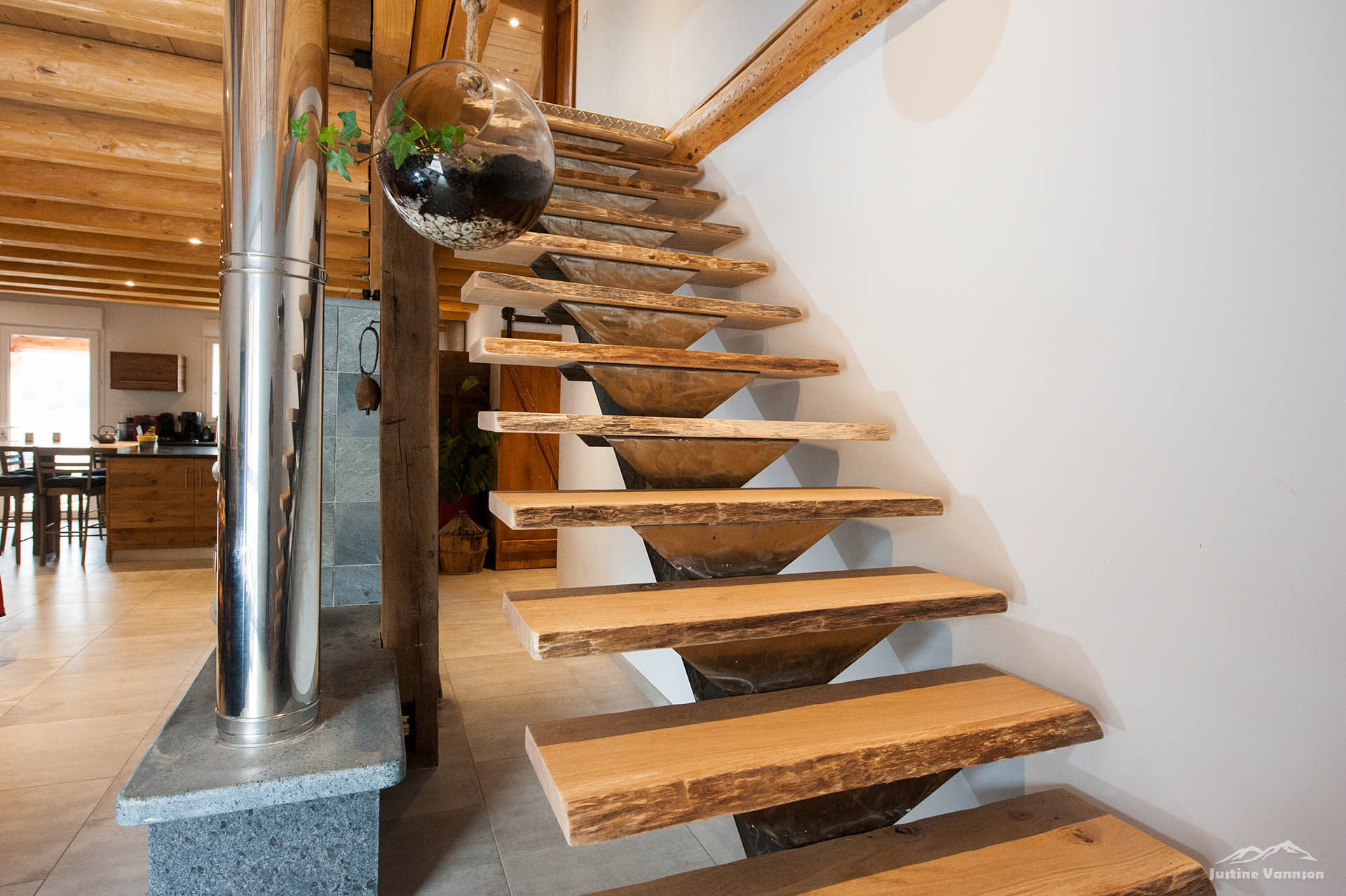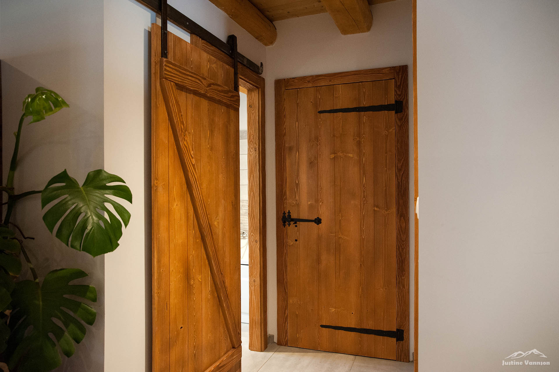 Portes en bois brossé sur chambranle, coulissante avec des vieux fers forgés… Un meuble de salle de bain au design travaillé, vasque en pierre. Et pour sublimer l’ensemble, une cuisine en vieux bois aux lignes contemporaines ! Alliant fonctionnalité, originalité et esthétique, cette cuisine est là pour sublimer l’espace à vivre.