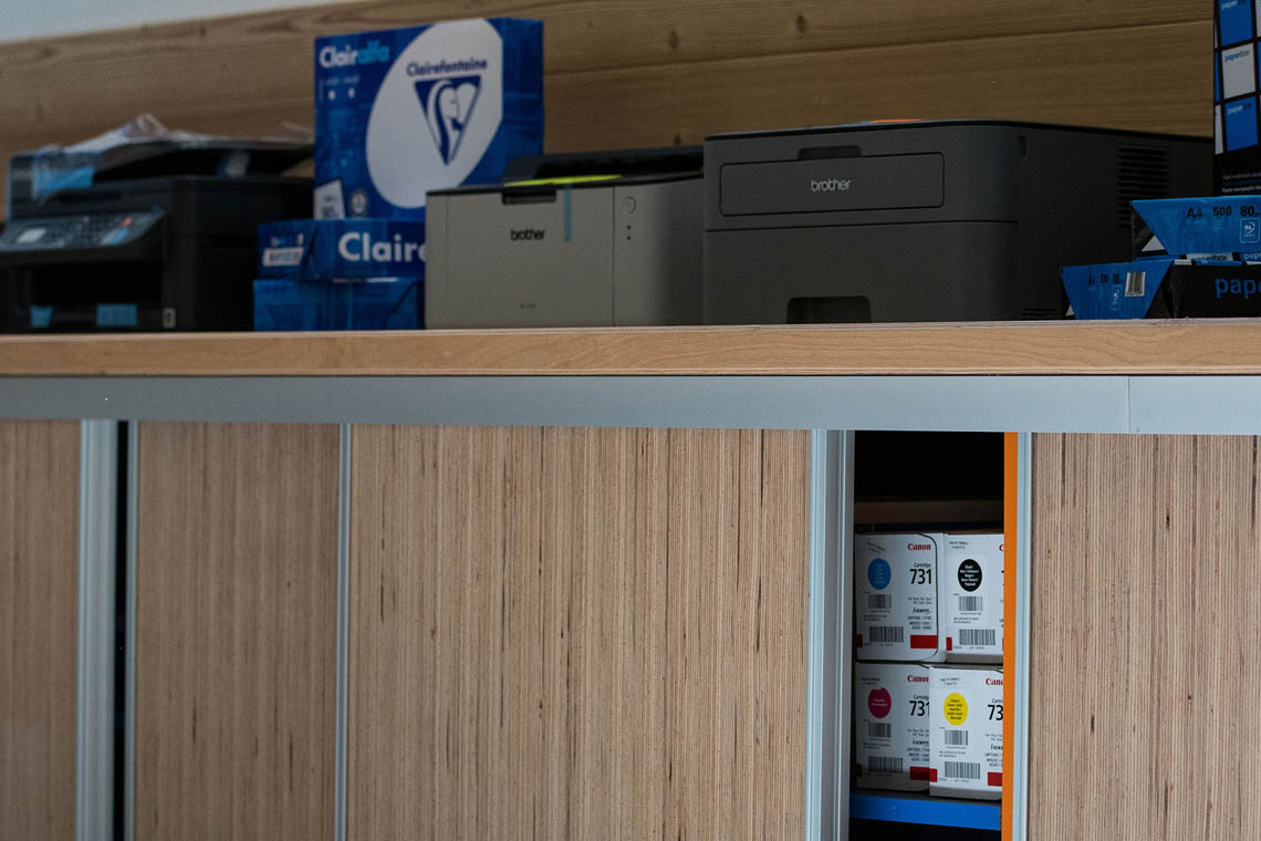 Les plans de travail de l’espace vente et des diverses étagères et consoles sont en panneaux multiligne hêtre et donnent un coté vraiment contemporain à cet ensemble.