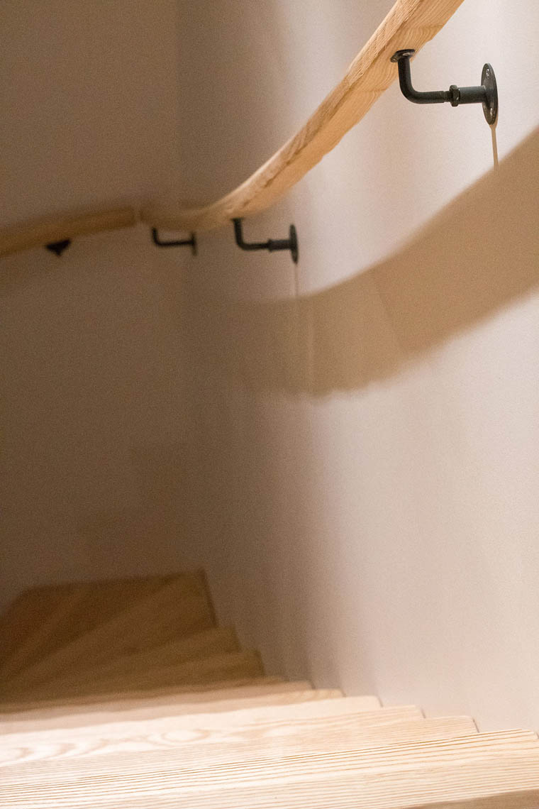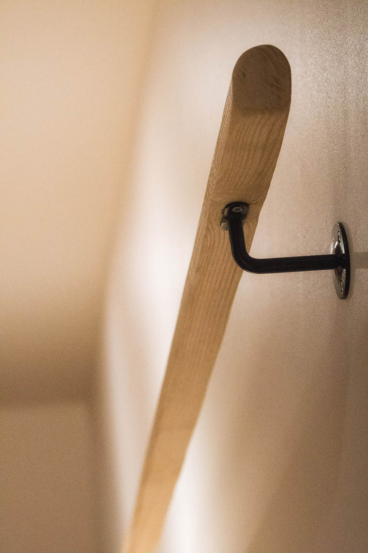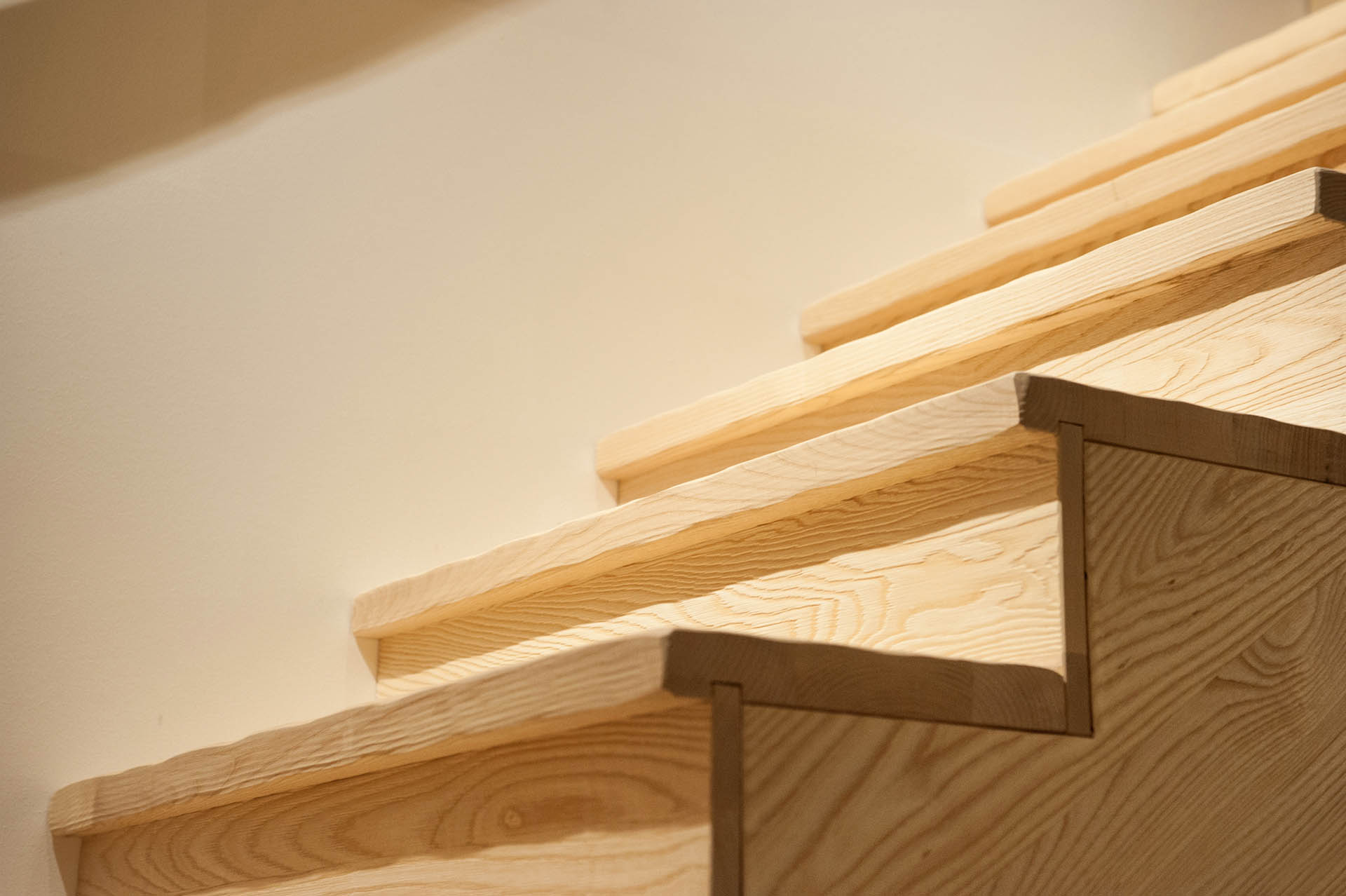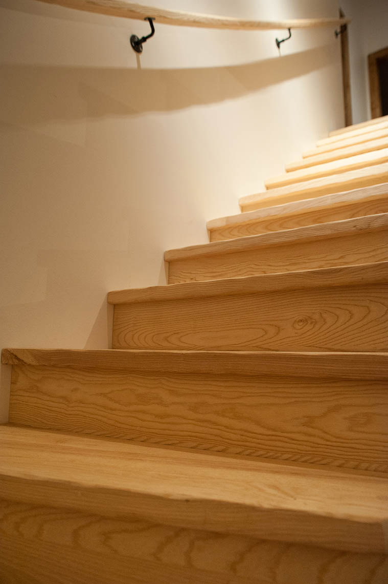 – Un escalier aux lignes douces et de couleur claire en frêne Olivier brossé, avec un ensemble de garde corps vitrés de manière à ne pas rompre le volume de la mezzanine.